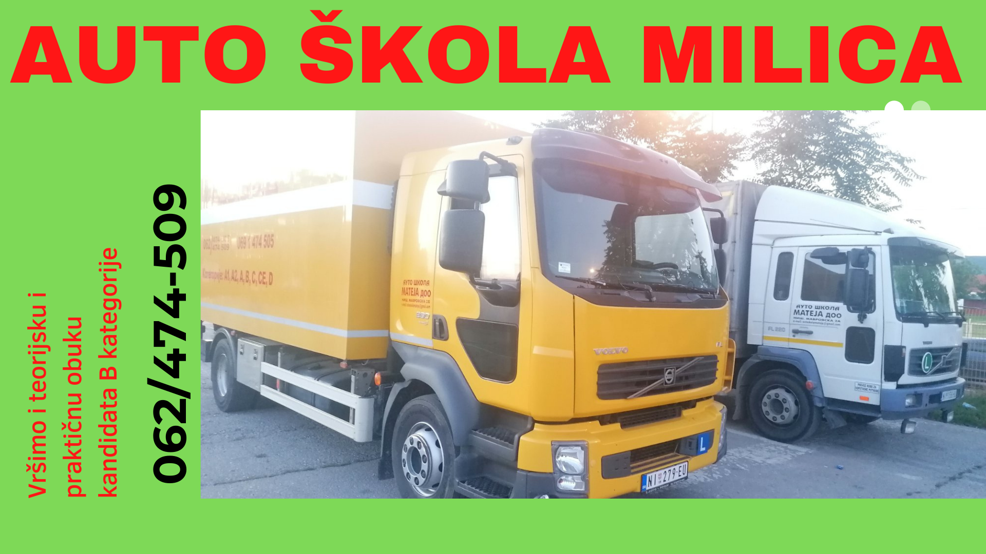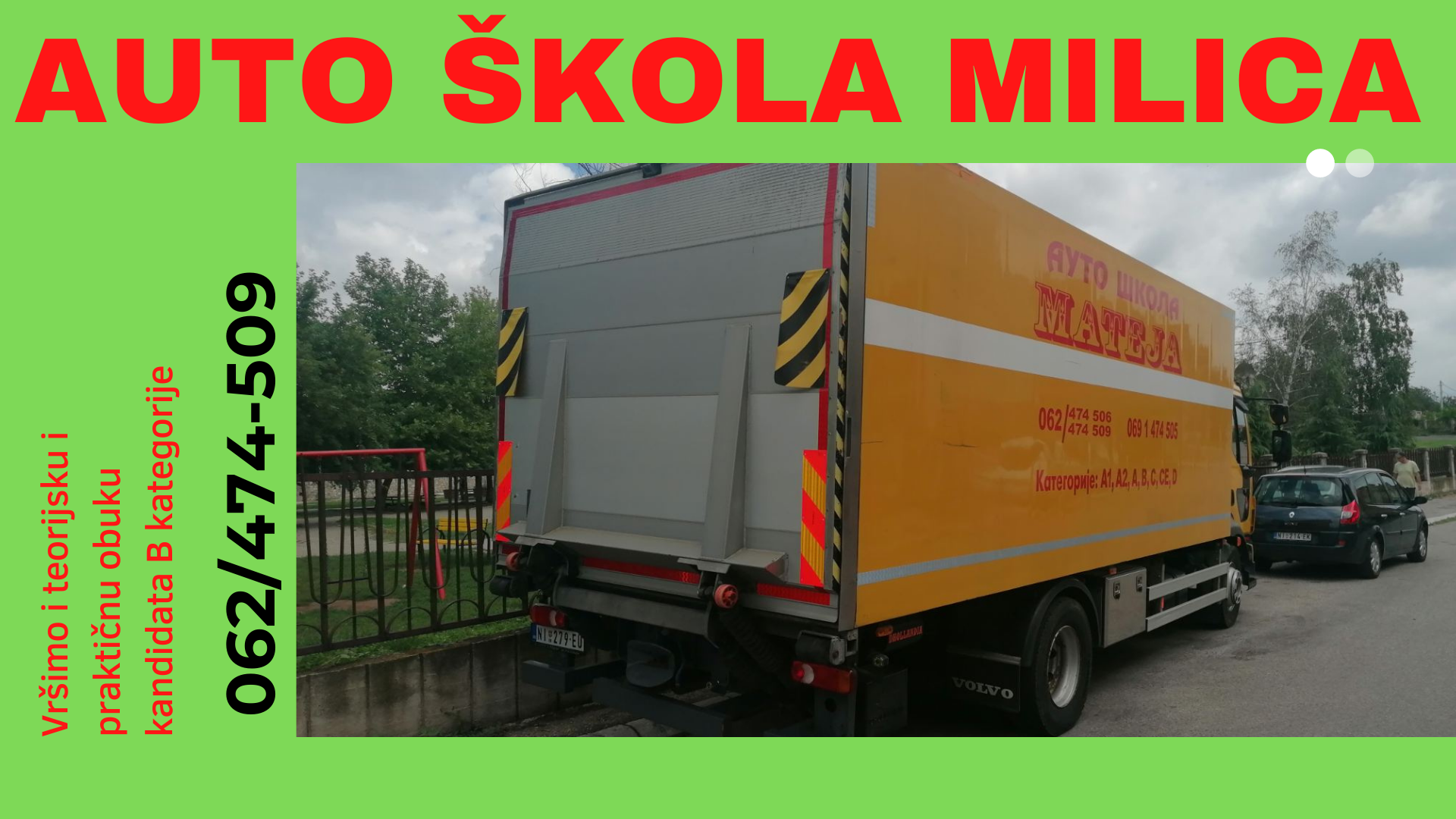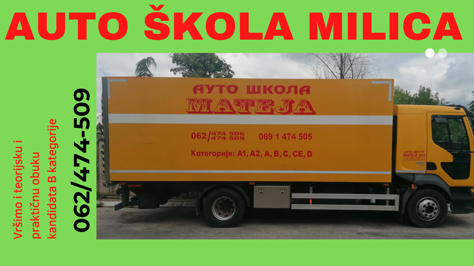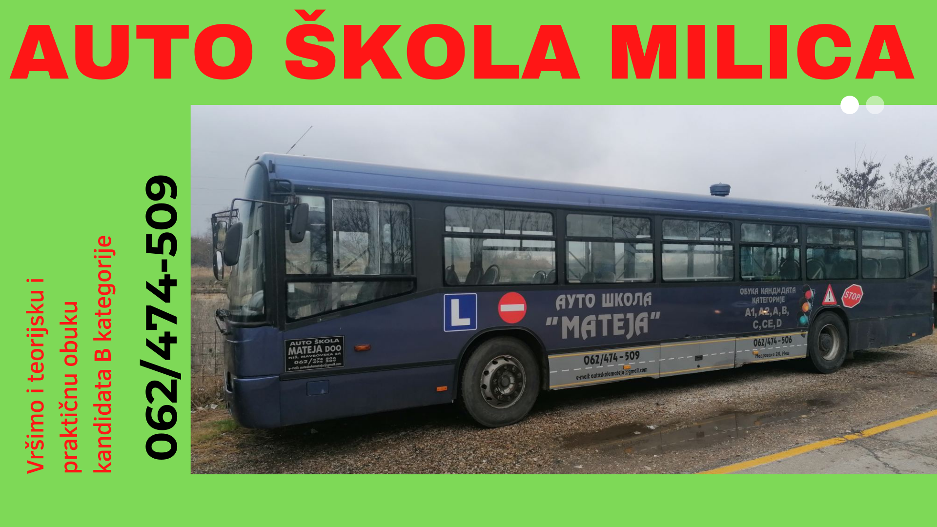 Auto škola Mateja, vrši teorijsku i praktičnu obuku kandidata za kategorije: „A“, „A1“, „A2″,“ B“,“ C“,“ CE“, „D“.