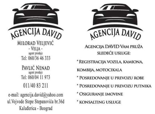 Novo otvorena Agencija za registraciju vozila, osiguranje nekretnina i usluge transpotra širom zemlje. Registracije vozila bez odlaska u MUP i posredovanje prevoza robe i putnika ka željenim destinacijama. Osiguranje raznih vrsta nektretnina kao i životno osiguranje.